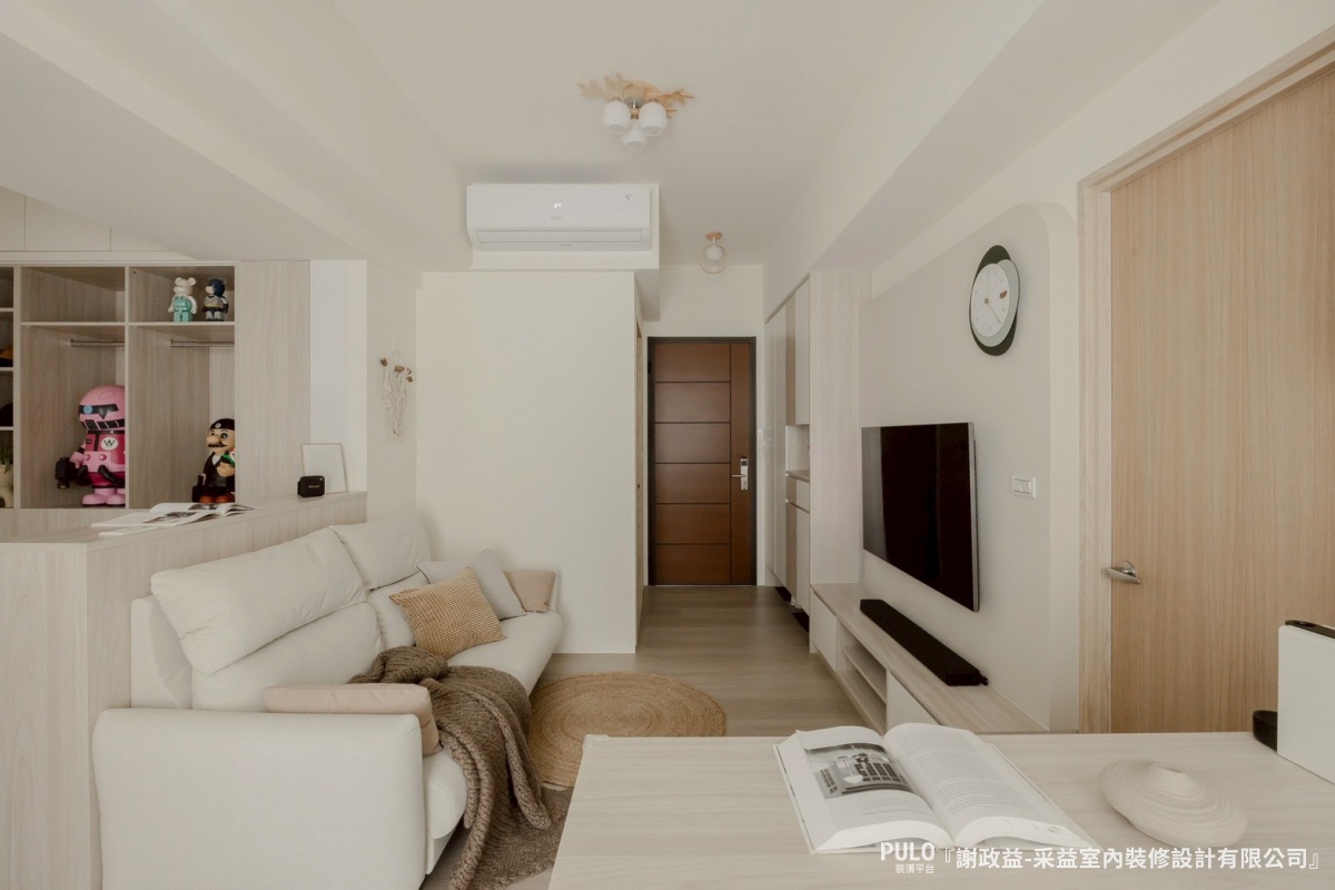 白色沙發、淺色地毯和抱枕,配合整體的白色與淺木色調,讓小空間看起來更開闊明亮。