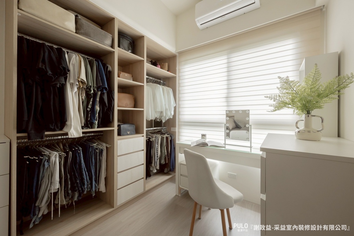 另一側做了開放式衣櫃,考量到小空間裡加門片會顯得擁擠,同時開放式設計拿取衣物也更直覺、方便,搭配白色和淺木色櫃體,也能維持整齊的視覺效果。